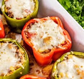 Juicy baked bell peppers with ground beef, onion, rice & tomatoes